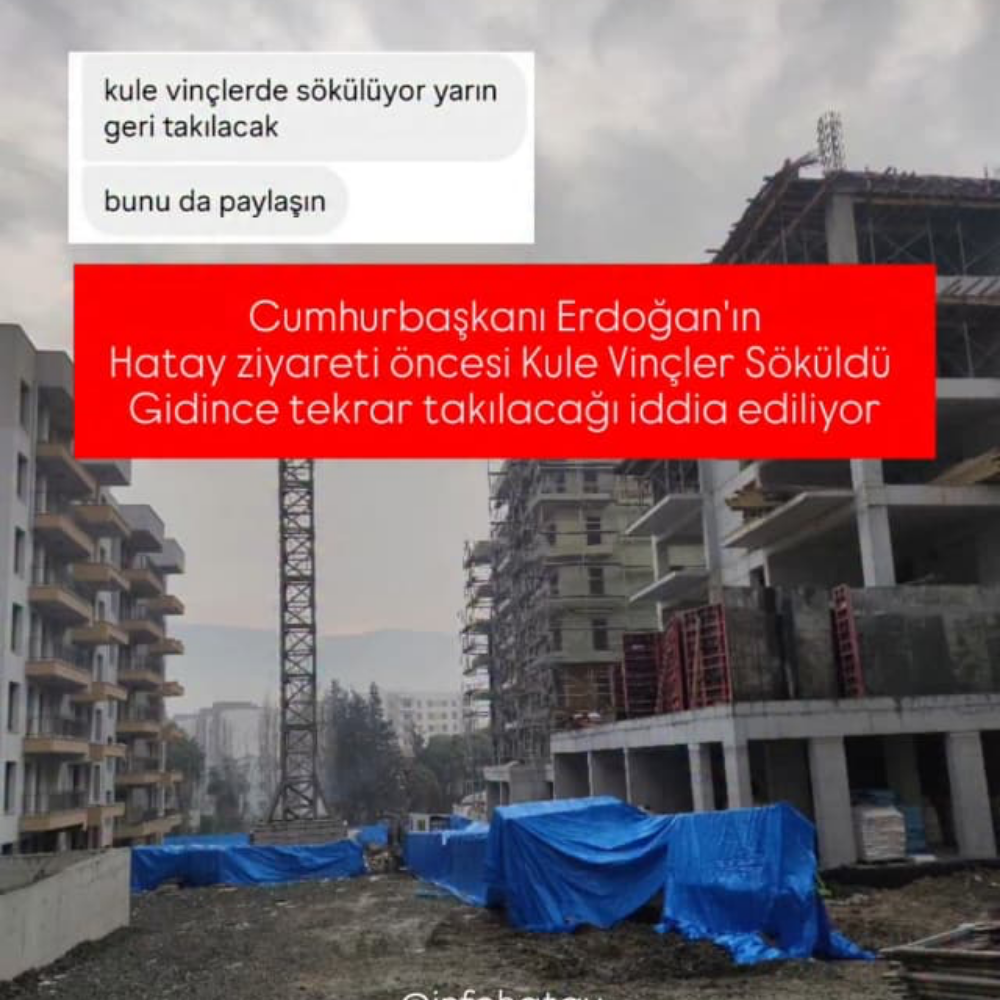 Hatay genelinde Erdoğan’ın güzergahı üzerindeki inşaat sahalarında, 10 kule vincin bu amaçla söküldüğü takdirde dahi milyonlarca lira harcanıyor. Bu da sadece vinç operasyonu için en az 3 ila 4 milyon lira arasında bir paranın, sırf "Erdoğan inşaat görmesin" diye harcandığı anlamına geliyor.