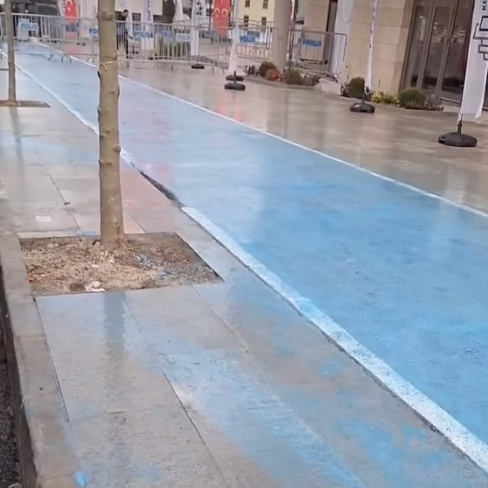 Yukarıdaki fotoğraf ile aşağıdaki fotoğraf aynı yere ait. Yalnızca bir gün arayla çekilen bu iki fotoğrafta yağan yağmur ile yapılan bisiklet yolunun silindiğini, boyaların aktığı görülüyor. Bir vincin sökülüp takılması yüz binlerce liraya mal oluyor