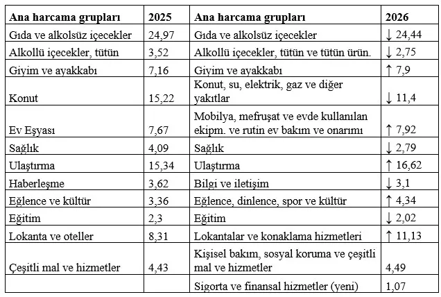 TÜFE madde sepeti ağırlıklarında değişimler şöyle: