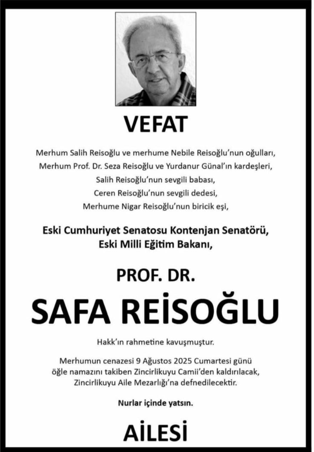 Medeni hukuk ve borçlar hukukunun Türkiye'de önde gelen isimlerinden ve Ankara Üniversitesi Siyasal Bilgiler Fakültesi'nin (Mülkiye) büyük hocalarından olan eski senatör ve Milli Eğitim Bakanı Prof. Dr. Safa Reisoğlu (96) hayatını kaybetti.