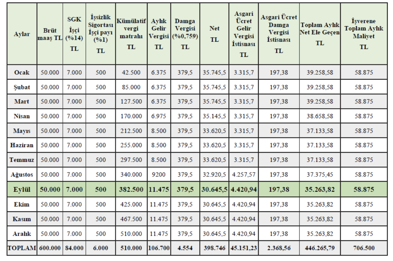 Yukarıdaki tabloda da görüldüğü üzere aylık brüt 50 bin lira alan bir çalışanın her ay 50 bin liralık brüt maaşından yüzde 14 SGK ile yüzde 1 işsizlik fonu kesilir.