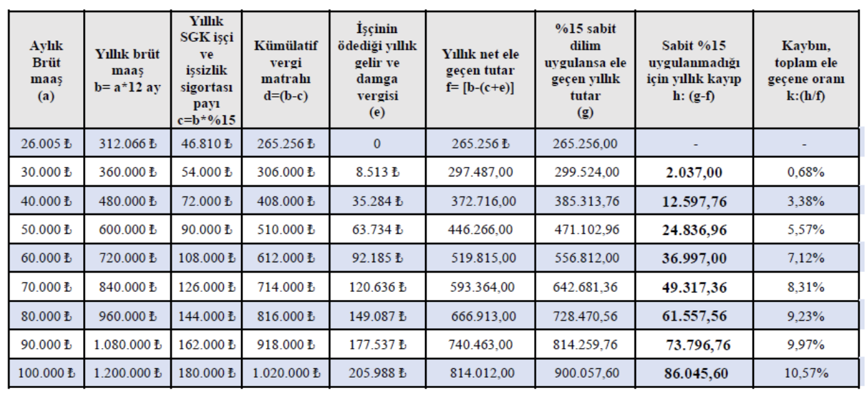 Aşağıdaki tabloda farklı brüt maaş alanların ellerine geçen yıllık tutarlar (f sütununda) ile yüzde 15 gibi sabit bir oran uygulansaydı ele geçecek yıllık tutarlar (g sütunu) görülmektedir. Ara zam yapılmadığını kabul ederek bu örnekleri yaptım.