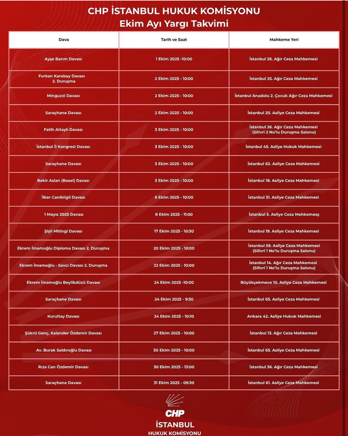 Görselde, CHP İstanbul Hukuk Komisyonu’nun ekim ayı boyunca takip edeceği davalar yer alıyor.