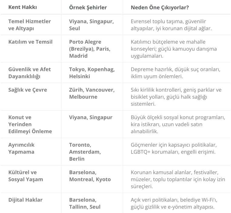 Listeye göre, en iyi uygulama şehirleri arasında Viyana (konut), Barselona (dijital haklar + katılım), Kopenhag (sürdürülebilirlik), Tokyo (afet dayanıklılığı) ve Toronto (kapsayıcılık) yer alıyor. Bunu kendi ülkemizin şehirlerine örnek olması açısından buraya aldım.