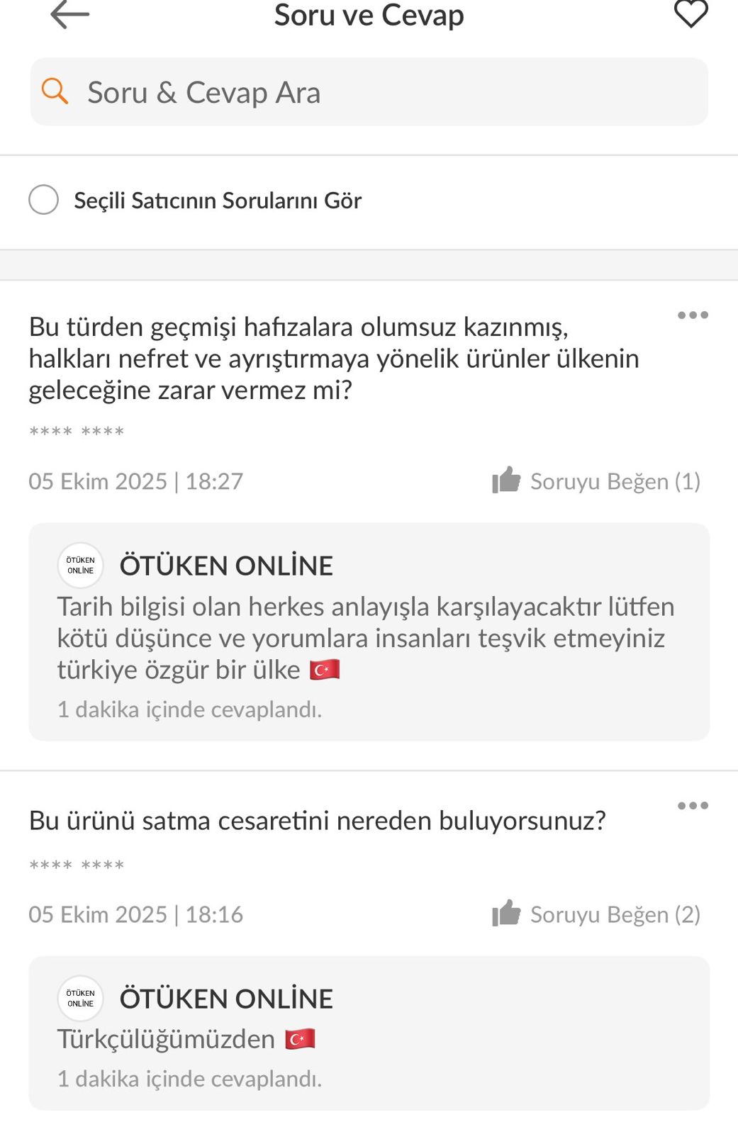 Ötüken Online isimli satıcının kullanıcılara cevabı