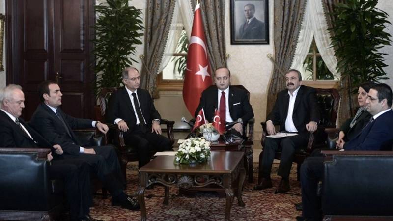 Dönemin Kamu Düzeni ve Güvenliği Müsteşarı Muhammed Dervişoğlu (sol başta), AKP Grup Başkanvekili Mahir Ünal, İçişleri Bakanı Efkan Ala, Başbakan Yardımcısı Yalçın Akdoğan ile HDP Milletvekilleri Sırrı Süreyya Önder, Pervin Buldan ve İdris Baluken / Dolmabahçe, 28 Şubat 2015
