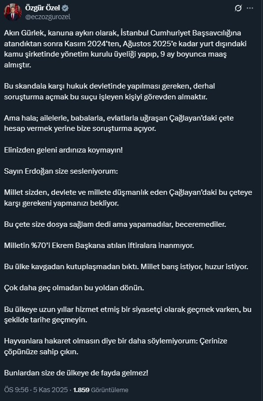 Özel ise, "Akın Gürlek, kanuna aykırı olarak, İstanbul Cumhuriyet Başsavcılığına atandıktan sonra 29 Kasım 2024’ten, 6 Ağustos 2025’e kadar yurt dışındaki kamu şirketinde yönetim kurulu üyeliği yapıp, 9 ay boyunca maaş almıştır" demişti.