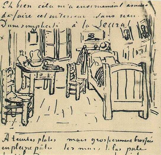 Van Gogh’un Theo’ya yazdığı mektupla yolladığı eskiz.Van Gogh 1888 yılında bu mektubu yazdığında 35 yaşındaydı ve kendini yorgun hissediyordu. Özellikle gözlerini dinlendirmesi gerektiği için iki gün resim yapmaya ara vermişti. Bu oda, aradığı huzurun bir imgesi olarak sanat tarihine geçti.