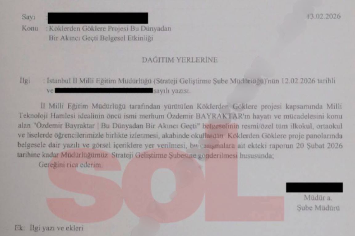 Okullara gönderilen yazıda “İl Millî Eğitim Müdürlüğü tarafından yürütülen Köklerden Gökler projesi kapsamında Millî Teknoloji Hamlesi idealinin öncü ismi merhum Özdemir BAYRAKTAR’ın hayatı ve mücadelesini konu alan ‘Özdemir Bayraktar | Bu Dünyadan Bir Akıncı Geçti’ belgeselinin resmî/özel tüm ilkokul, ortaokul ve liselerde öğrencilerimizle birlikte izlenmesi, akabinde okullardan Köklerden Gökler proje panolarında belgeselbelgesel izletilecek sonra dae dair yazılı ve görsel içeriklere yer verilmesi, bu çalışmalara ait ekteki raporun 20 Şubat 2026 tarihine kadar Müdürlüğümüz Strateji Geliştirme Şubesine gönderilmesi hususunda; Gereğini rica ederim” denildi.