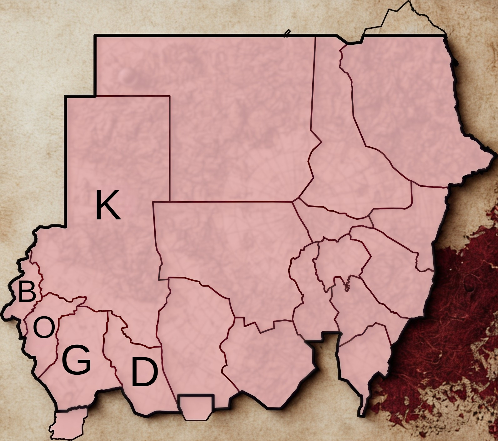 HDK tarafından kontrol edilen ve beş eyaletten oluşan Darfur'un Sudan haritasındaki konumu. (K: Kuzey Darfur, B: Batı Darfur, O: Orta Darfur, G: Güney Darfur, D: Doğu Darfur)Mısır'dan havalanan ve Sudan'a saldıran Türk İHA'ları