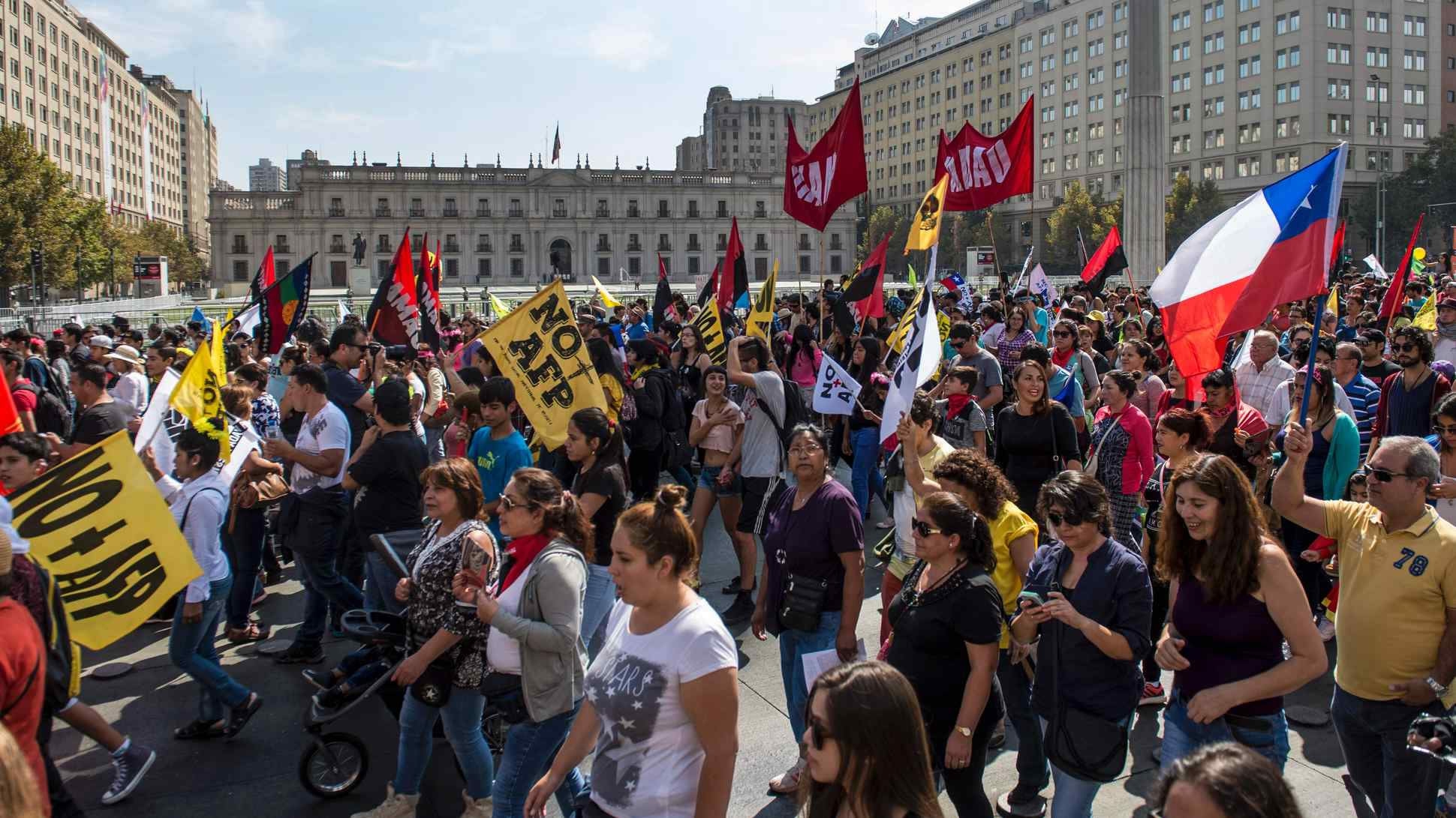 Başkent Santiago'da 2017'de emeklilik reformu talebiyle yapılan bir gösteri.Pinochet döneminin yasaları hayatta