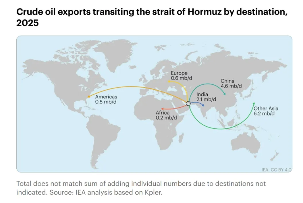 Hürmüz Boğazı’ndan geçen yakıtın çok önemli kısmı Asya'ya gidiyor (aşağıdaki görselde görüldüğü gibi). Arz şoku ve yükselen fiyatlar savaşın ekonomik etkilerini kontrol altına almaya çalışan zengin ve fakir ülkelerin bulunduğu Asya'yı sarsıyor.