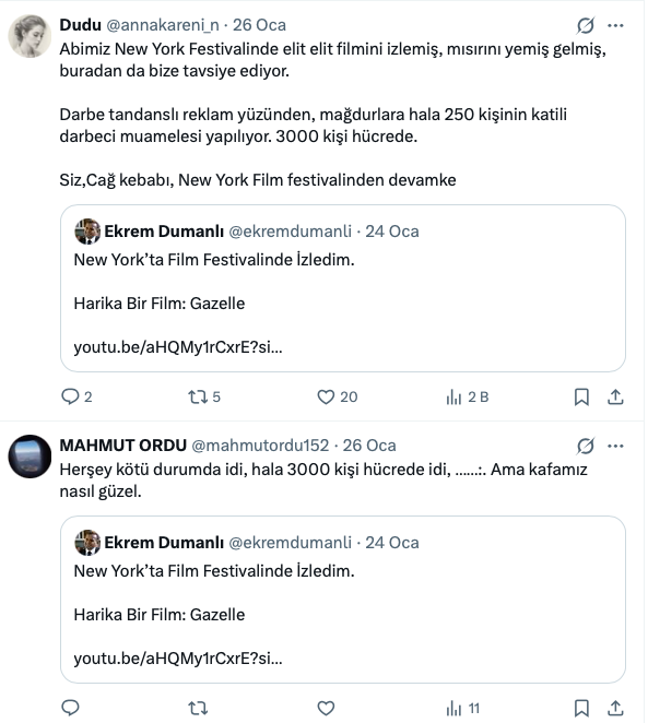ABD'de, New York'ta gittiği film festivalinde izlediği bir filme dair video çeken Dumanlı, bunu sosyal medya hesabından paylaşırken, gelen tepkiler şöyle oldu: “İnsan biraz utanır yahu,biraz yüzü kızarır, tövbe eder sebep olduklarından dolayı. Yürekler yangın yeri sen saçını tara” “Binlerce insanın hayatını kararttıgınız bır fılım cevırdınız o sıze yetmez mı” “Utanma arlanma da kalmamış, millet hücrede kalıyor sizin yüzünüzden, ayyy bu paylaşımı yapacagıma yerın dıbıne girmeyı tercih ederdim.. ..binlerce ınsanı yokluğa sosyal soykırıma terk et..sinema keyfi..”